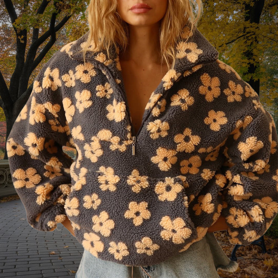 The boho-inspired flowers add a playful and elegant touch, while the slightly oversized cut ensures a casual and comfortable look. Whether you're taking a coffee break in the city or enjoying a quiet evening on the sofa, this fleece combines warmth and personality.